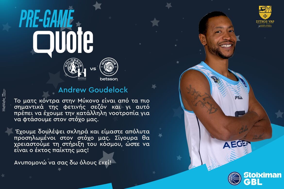 Την άποψή του για την εντός έδρας αναμέτρηση του Κολοσσού H Hotels Collection με την Μυκονο (27/12, 16:00), για την 12η αγωνιστική της Stoiximan GBL, μοιράστηκε ο Andrew Goudelock. Η δήλωση του Andrew Goudelock στο www.kolossosbc.gr: «To ματς κόντρα στην Μύκονο είναι...