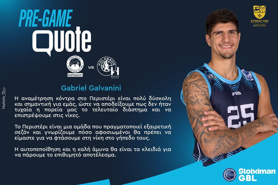 Την άποψή του για την εκτός έδρας αναμέτρηση του Κολοσσού H Hotels Collection απέναντι στον Περιστερί Betsson (4/4, 16:00), για τη 24η αγωνιστική της Stoiximan GBL, μοιράστηκε ο Γάμπριελ Γκαλβανίνι. Η δήλωση του Γκάμπριελ Γκαλβανίνι στο www.kolossosbc.gr: «Η αναμέτρηση κόντρα στο Περιστέρι...