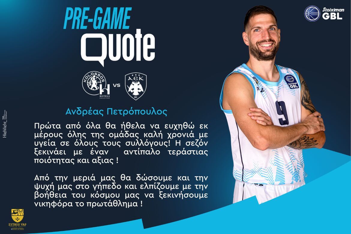 Την άποψή του για την πρεμιέρα του Κολοσσού H Hotels Collection, στη φετινή Stoiximan GBL, απέναντι στην AEK (4/10, 16:00), μοιράστηκε ο Ανδρέας Πετρόπουλος. Η δήλωση του Ανδρέα Πετρόπουλου στο www.kolossosbc.gr: «Πρώτα απ’ όλα, θα ήθελα να ευχηθώ εκ μέρους όλης της...