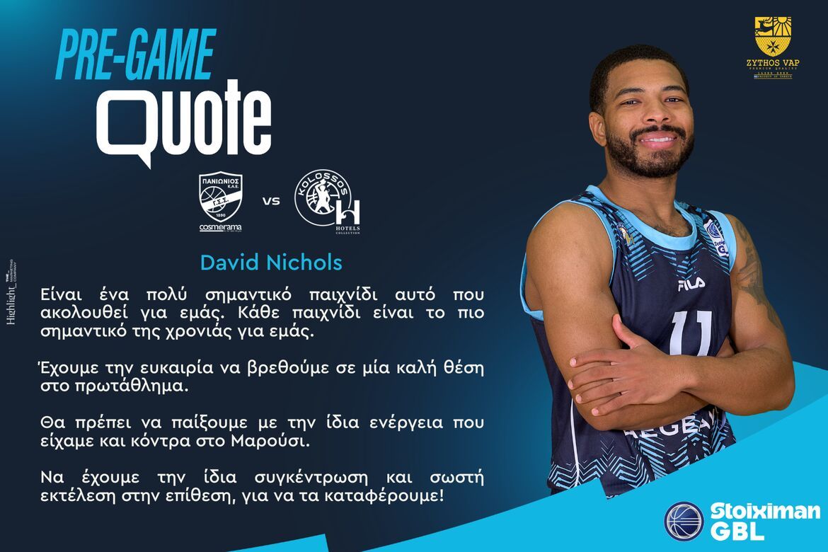Την άποψή του για την εκτός έδρας αναμέτρηση του Κολοσσού H Hotels Collection απέναντι στον Πανιώνιο (10/1, 18:15), για τη 14η αγωνιστική της Stoiximan GBL, μοιράστηκε ο Ντέιβιντ Νίκολς. Η δήλωση του Ντέιβιντ Νίκολς στο www.kolossosbc.gr: «Είναι ένα πολύ σημαντικό παιχνίδι αυτό...