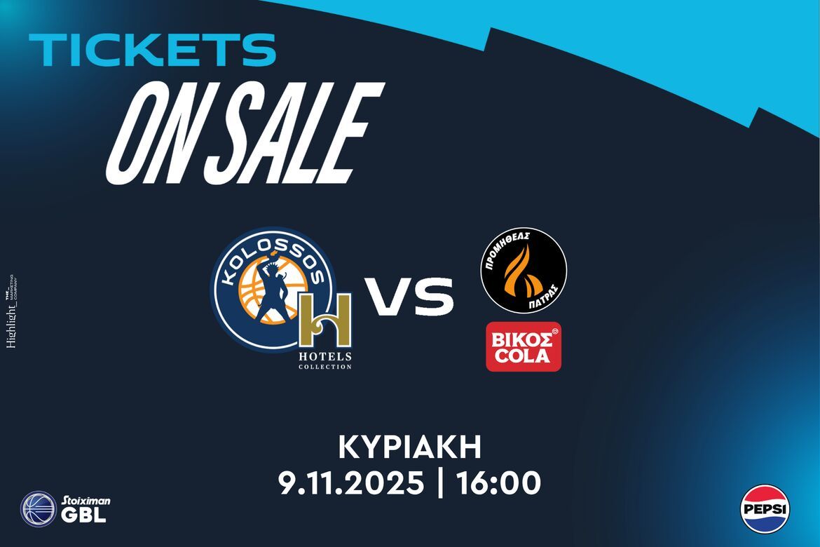 Η ΚΑΕ Κολοσσός H Hotels Collection ανακοινώνει την έναρξη της πώλησης των εισιτηρίων του αγώνα με τον Προμηθέα Πάτρας Βίκος Cola για την 6η αγωνιστική της Stoiximan GBL 2025-2026. ΚΟΛΟΣΣΟΣ H HOTELS COLLECTION – ΠΡΟΜΗΘΕΑΣ ΠΑΤΡΑΣ ΒΙΚΟΣ COLA Κυριακή 9 Νοεμβρίου στις 16:00 Τιμή εισιτηρίων:...