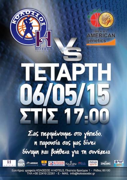 H Κ.Α.Ε. Κολοσσός H Hotels ανακοινώνει ότι τα εισιτήρια του αυριανού αγώνα κόντρα στον ΚΑΟΔ (06/05 - 17:00) θα διατίθενται την ημέρα του αγώνα από τα γραφεία της Κ.Α.Ε. (πλατεία Βρούχου, τηλ. 22410-22261) από τις 10:00 μέχρι τις 13:00 και...